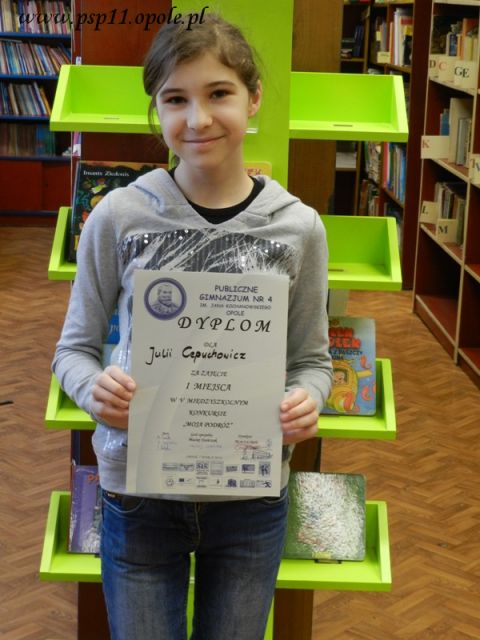 Wczoraj w PG 4 w Opolu na konkursie "Ludzie w podróży" Julia Cepuchowicz z klasy VIc zajęła I miejsce w Opolu przedstawiając prezentację multimedialną ze swojej podróży do Egiptu, którą odbyła wraz z rodzicami w lipcu ubiegłego roku.