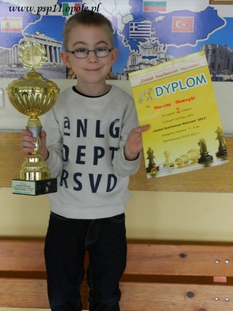 Marcin Skorupka z klasy Ib zajął I miejsce w drugim turnieju szachowym dla dzieci i młodzieży "Zostań Szachowym Mistrzem 2013" w kategorii wiekowej 7-9 lat. Serdecznie gratulujemy.