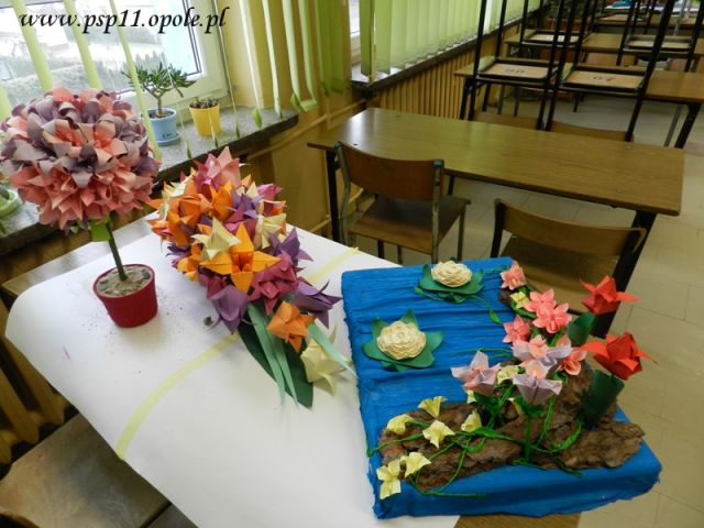 Uczniowie klas I-VI wykonali prace na Międzyszkolny Konkurs Orgiami pt .” Ikebany i bukiety” . Zgodnie z regulaminem konkursu do kolejnego etapu wybrano 3 prace ; Marysi Szatny kl IIa, Emilii Futkowskiej zkl. IVb oraz Natalii Szarejko z IVa.