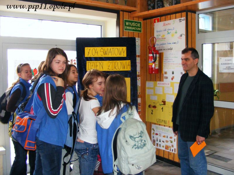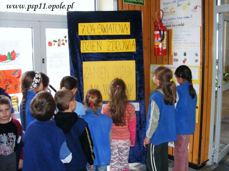 W dniu dzisiejszym obchodzony jest Światowy Dzień Zdrowia. W naszej szkole przebiega on pod hasłem "Zamień czipsy na witaminy". W holu szkoły wystawione zostały prace plastyczne wykonane przez uczniów klas IVa i IV b na lekcjach wychowania zdrowotnego. Pani Iwona Dekiela omawiała na lekcjach tematykę zdrowego żywienia, prawidłowego komponowaniqa posiłków, zwracała szczególną uwagę na produkty małowartościowe, których składniki nie zawsze służą zdrowiu młodego człowieka.